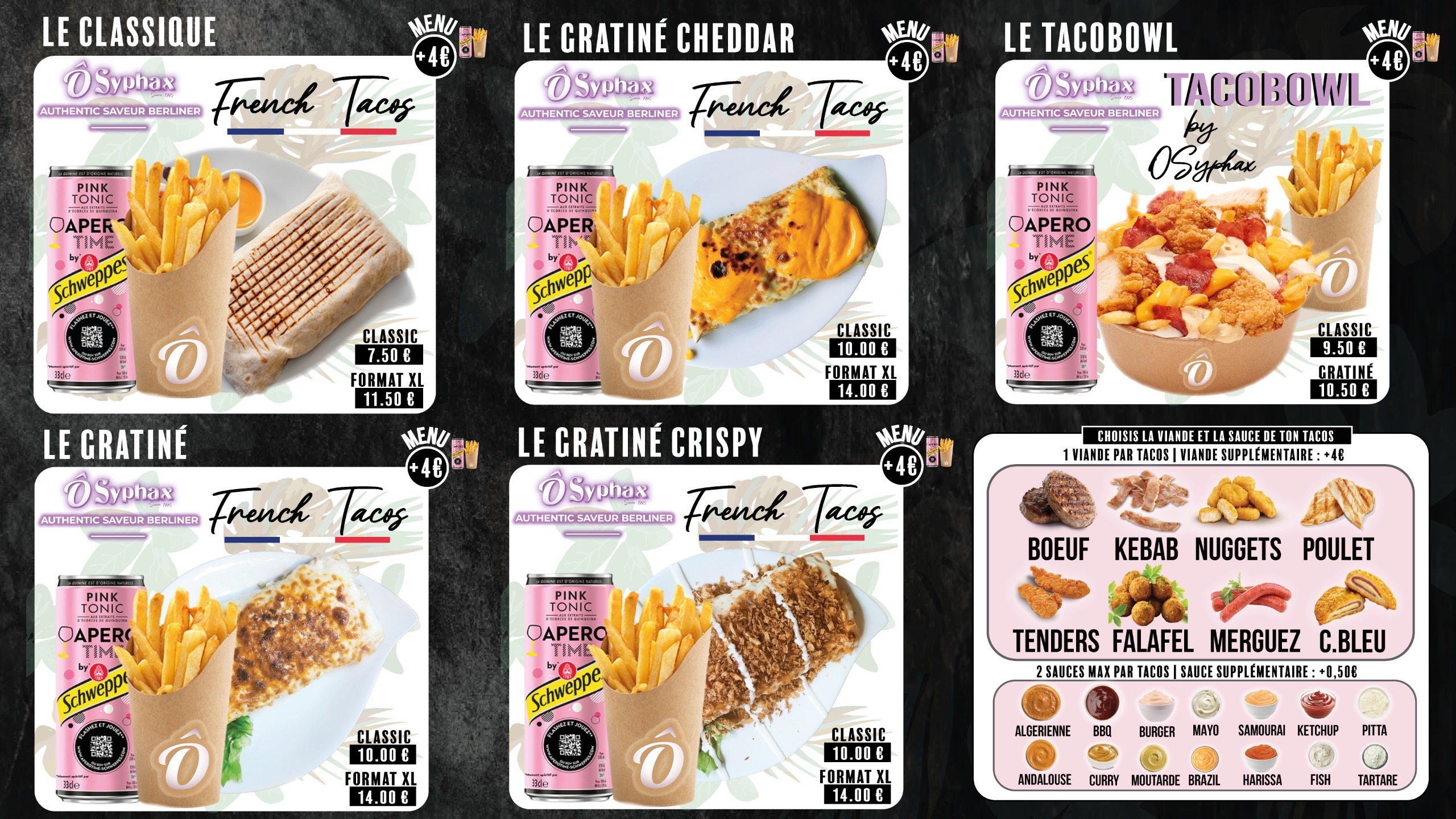 À cela s’ajoutent nos French Tacos premium, garnis de produits soigneusement sélectionnés et nappés de notre sauce fromagère maison, ainsi que nos plats végétariens, bowls et salades fraîches, pour satisfaire toutes les envies.